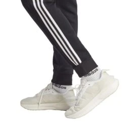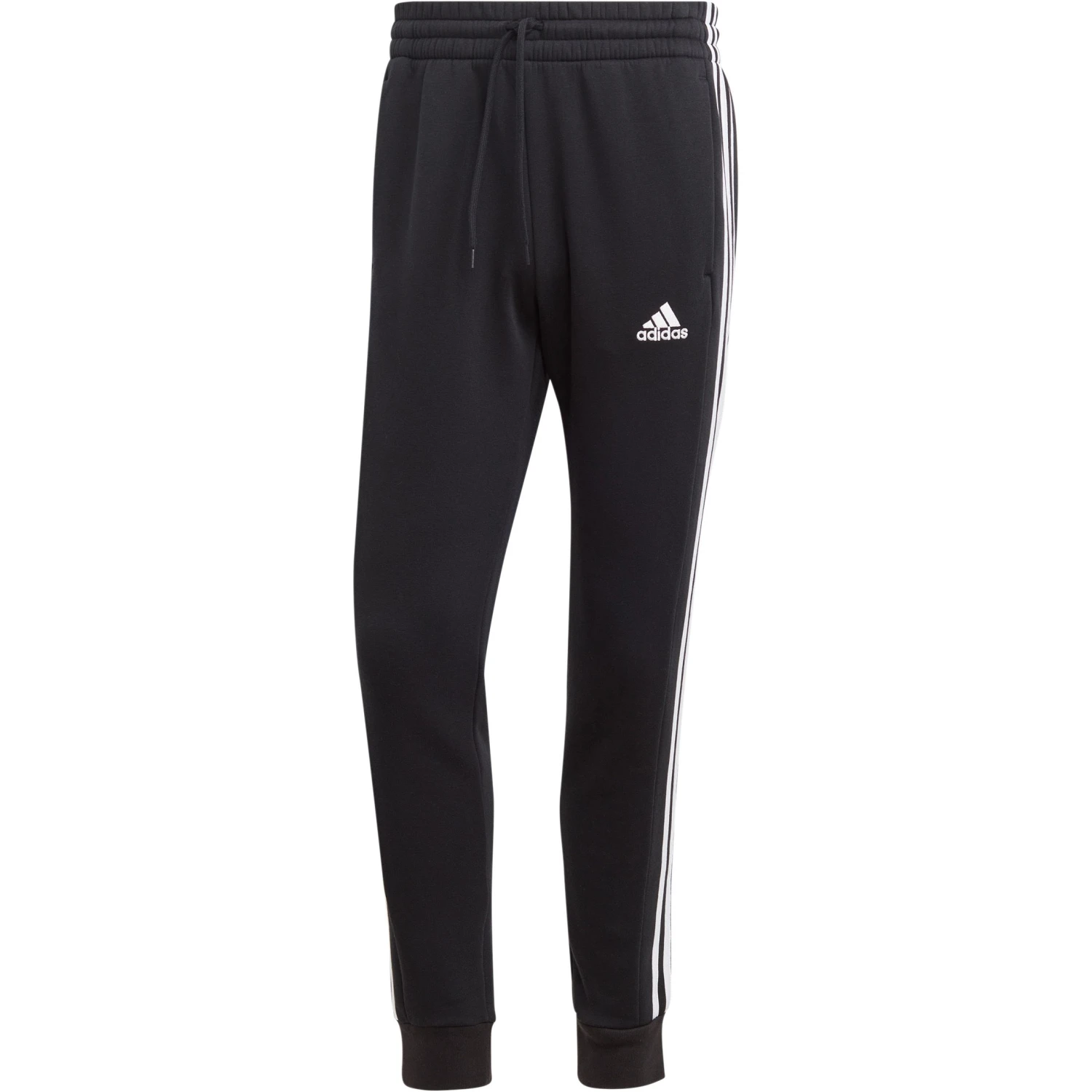 De adidas Essential Fleece 3-Stripes Tapered Cuff joggingbroek voor heren houdt u heerlijk warm op een frisse dag. Deze comfortabele broek heeft een elastische tailleband met trekkoord voor de perfecte aansluiting en voelt zacht door de pluizige fleece binnenzijde. Met de handige zakken kunt u uw telefoon en sleutels meenemen.