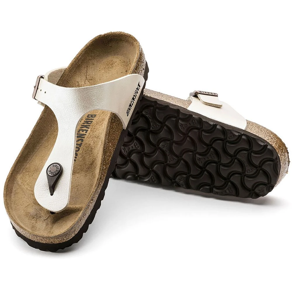 De Birkenstock Gizeh slippers in de kleur graceful pearl white hebben een normale pasvorm en een hoog draagcomfort. Dit model is een stilistische alleskunner en een echte klassieker. De elegante teenslippers combineren optimale steun met een minimalistisch design. Het bovenmateriaal bestaat uit het huidvriendelijke en slijtvaste materiaal Birko-flor® met een mooie zijdeglans afwerking. De EVA buitenzool zorgt voor een prettige demping. Het voetbed van suède voelt heerlijk zacht aan de voeten.