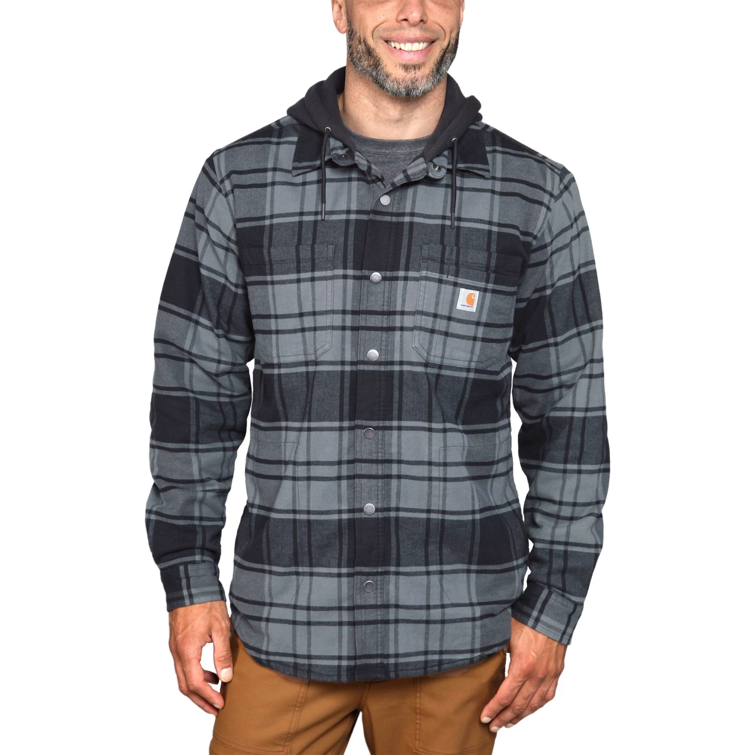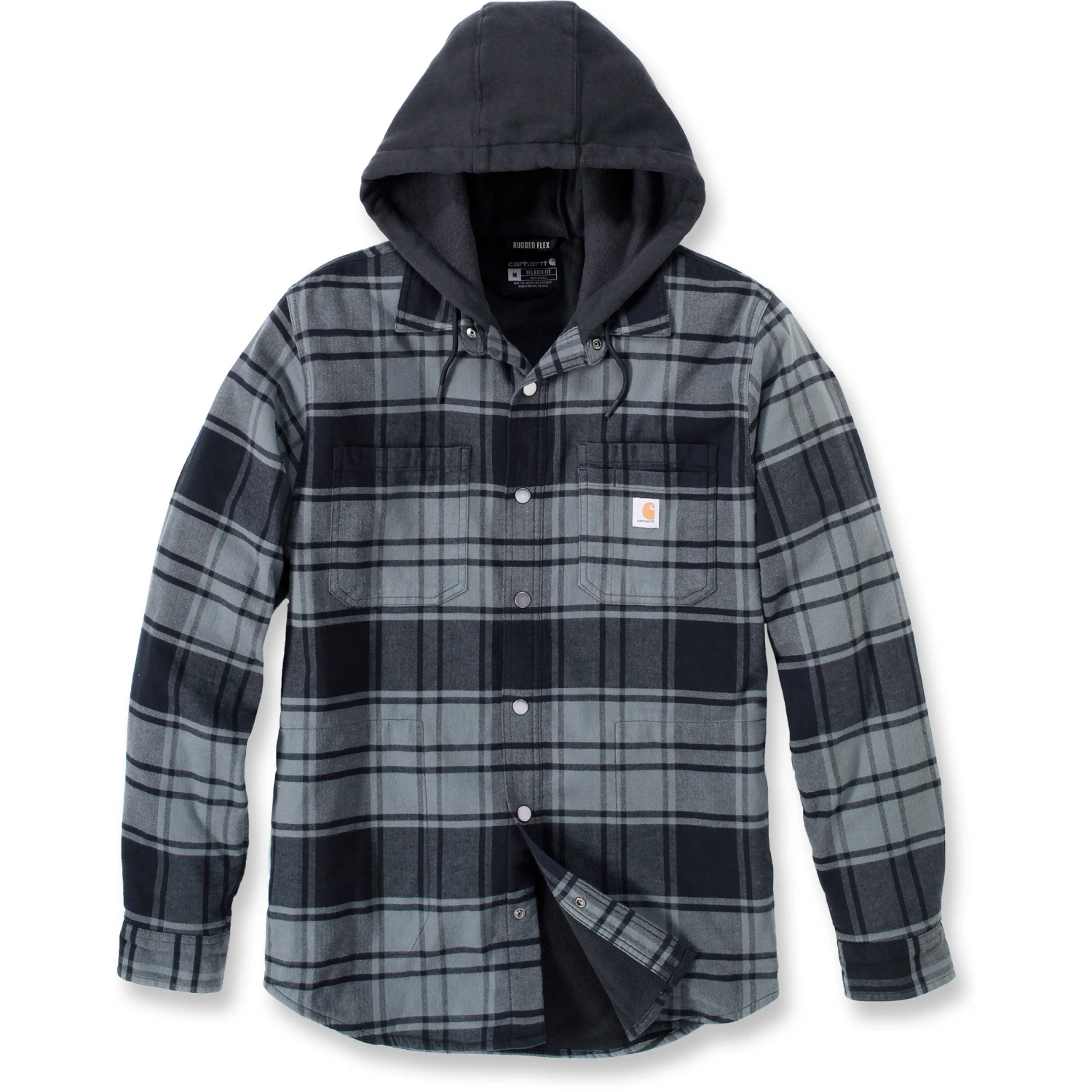 De Carhartt Flannel Fleece Lined Hooded jas voor heren heeft een losse pasvorm en is voorzien van een vaste capuchon. De zachte voering zorgt dat u heerlijk warm blijft tijdens uw buiten activiteiten.