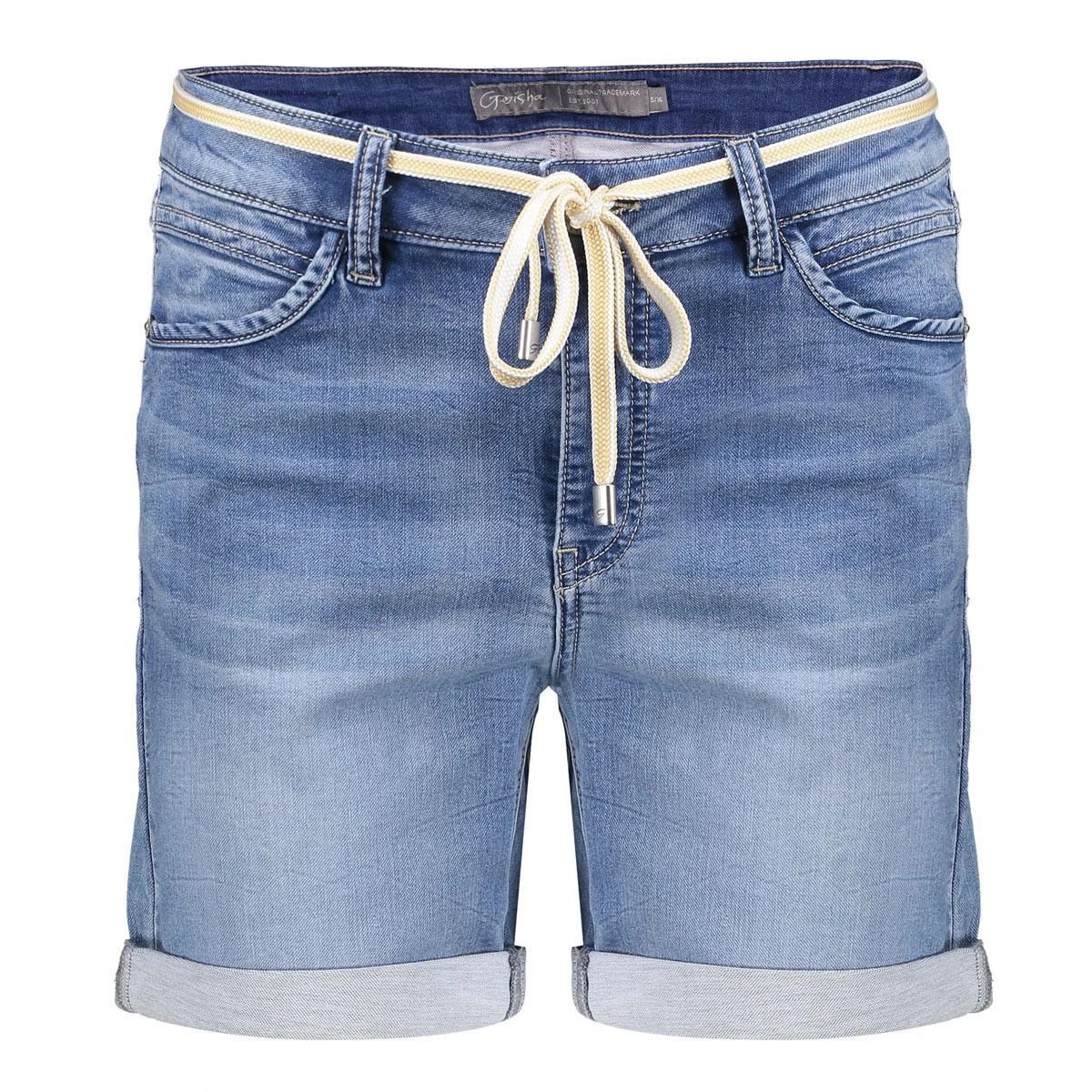 De Geisha Denim short valt op het bovenbeen en heeft omgeslagen broekspijpen.