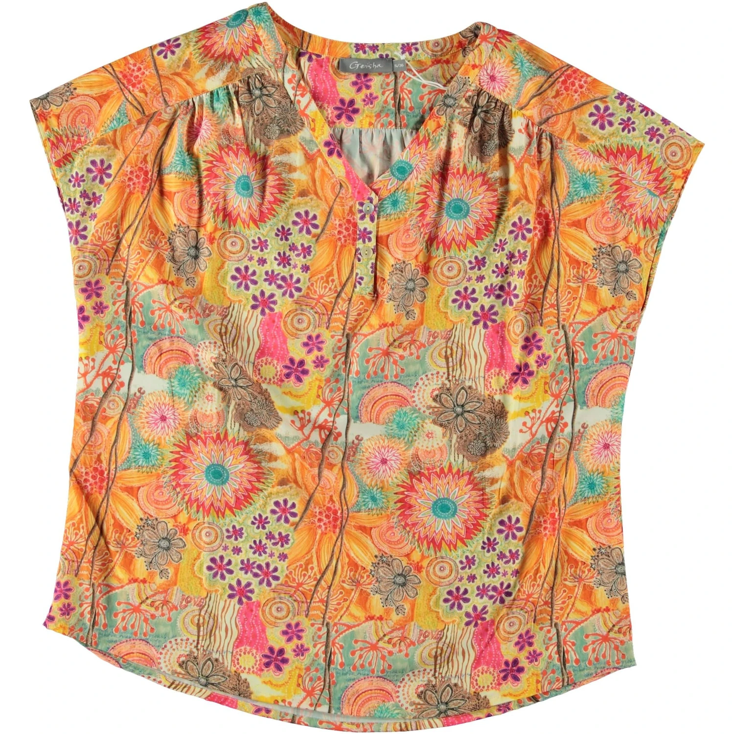Het Geisha Multi Flowers shirt voor dames heeft een V-hals met knoopjes. Het shirt valt tot op de heupen en heeft een multi flower print.