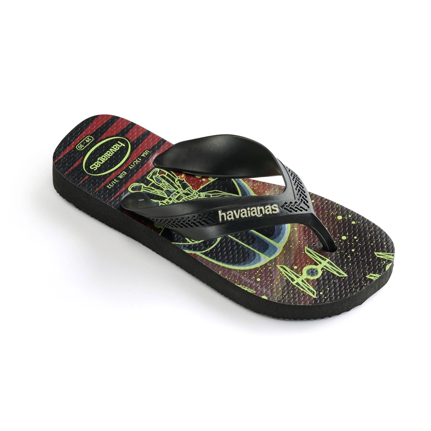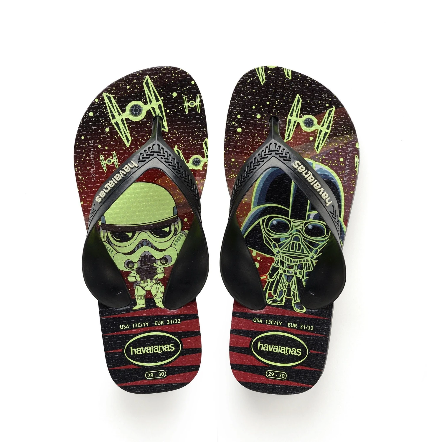 De populaire Max Star Wars slippers van Havaianas voor kinderen hebben een stoere print van Darth Vader en Imperial Stormtrooper. Het comfortabele voetbed van de waterbestendige slippers hebben een bordeaux rood met zwarte kleur. De rubberen zool is hittebestendig en bevat een bakstenen patroon.