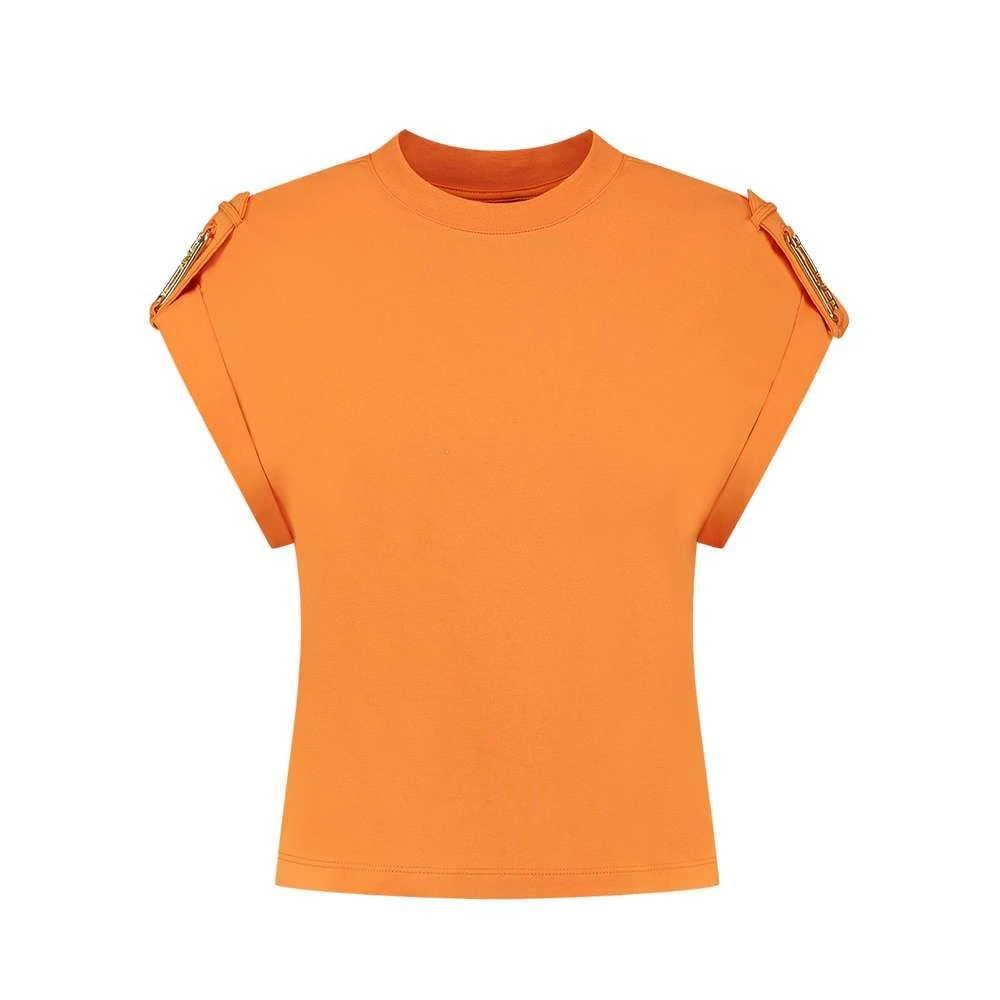 Dit NIKKIE Epaulette Plate shirt voor dames komt in de zomerse kleur sun orange. Dit T-shirt voelt heerlijk zacht aan en heeft een losse pasvorm. De schouders van het shirt zijn afgewerkt met gouden details wat het geheel net iets extra’s geeft.