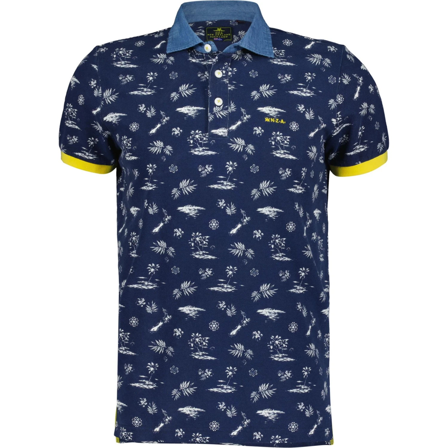 De Sulphur polo voor heren van NZA New Zealand Auckland geven u dankzij de vrolijke print direct ‘summer vibes’. De gele accenten op de mouwen en de denim kraag geven deze polo een fris en vrolijk uiterlijk. Het shirt is van hoogwaardig 100% pique katoen waardoor het extreem comfortabel is om te dragen.