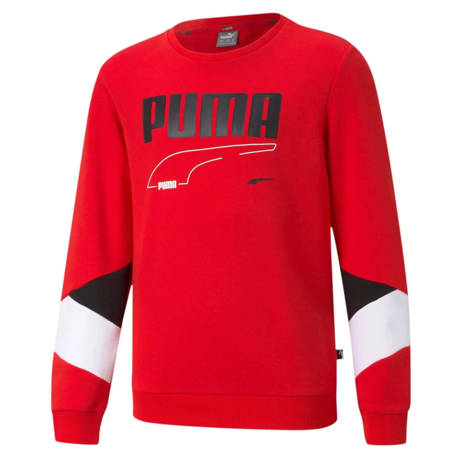 De Puma Rebel Crew sweater junior in de kleur high risk red is een comfortabele warme trui met ronde hals. Deze Puma sweater heeft een ronde hals en grote print op de borst. Verder is de trui voorzien van geribbelde boorden bij de polsen en zoom, hierdoor blijft alle warmte binnen en kan er geen koude lucht binnentrekken.