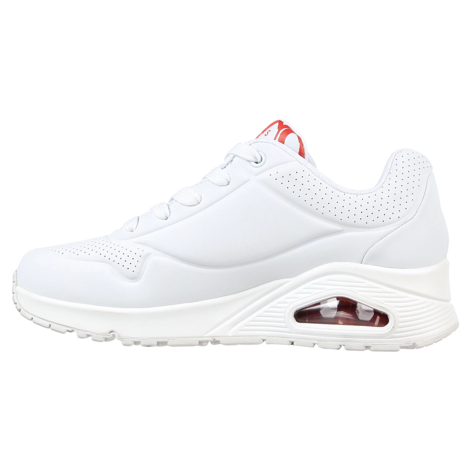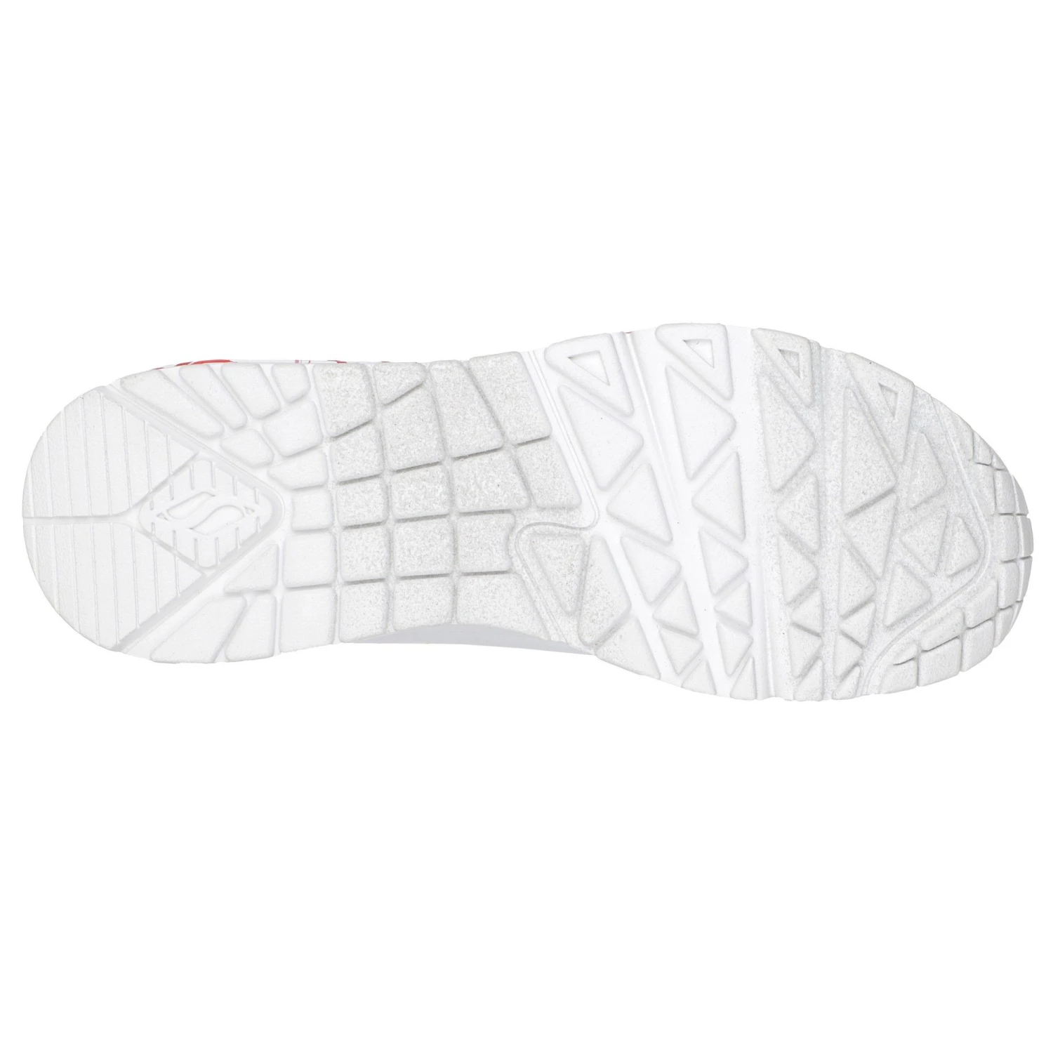 De Skechers Uno – Spread the Love vrijetijdsschoenen voor dames hebben goede grip en geven een dempend gevoel. De demping komt door de Skech-air tussenzool die zichtbaar is in de hak. Deze schoenen hebben het hart design van de beroemde kunstenaar James GoldCrown. De fleurige schoenen hebben een klassiek sneakerontwerp met vetersluiting.